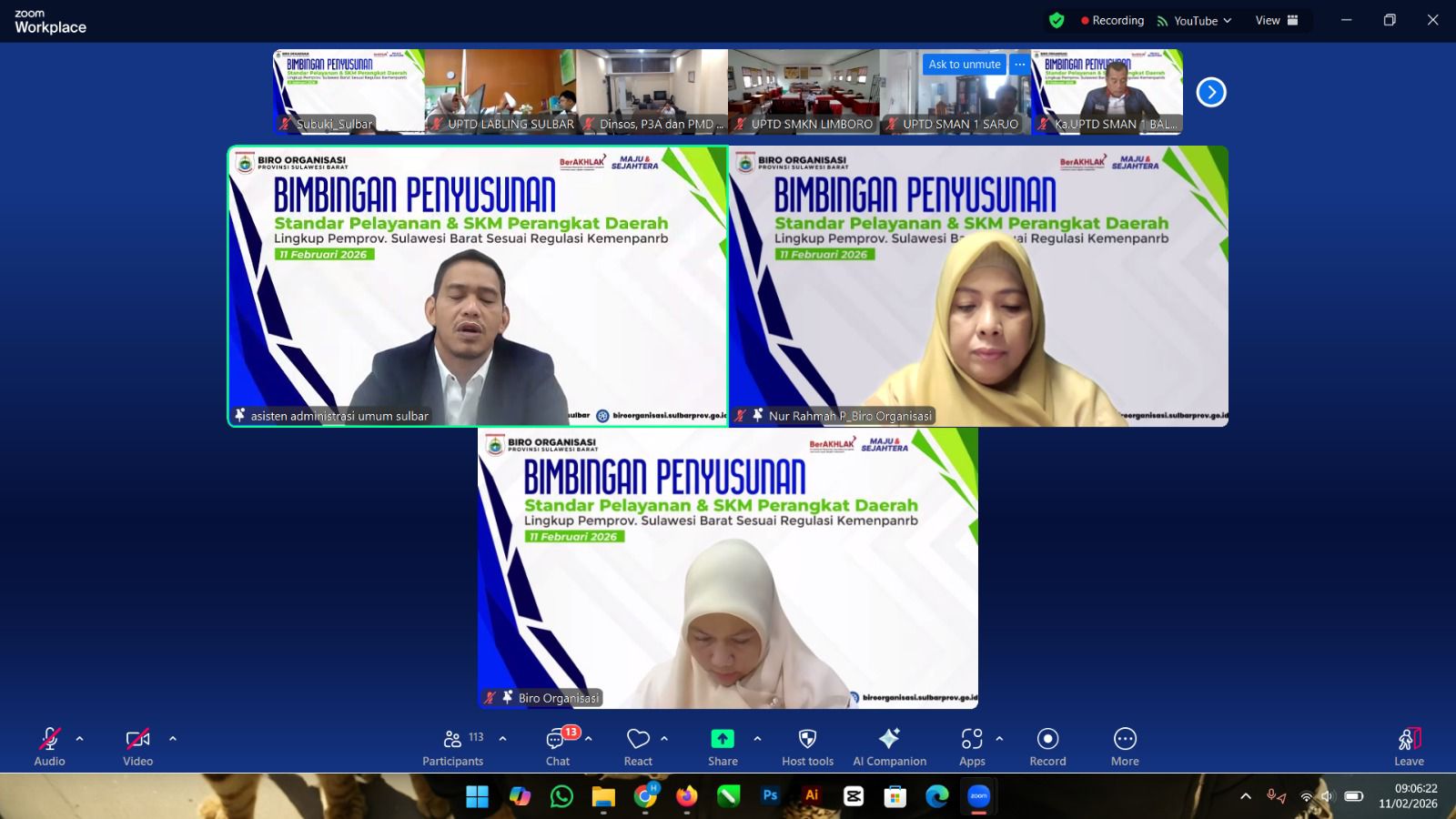 MAMUJU, SULBARTODAY – Untuk meningkatkan kualitas penyelenggaraan pelayanan publik secara berkelanjutan, memastikan kepuasan masyarakat, dan memperkuat tata kelola pemerintahan yang akuntabel, Biro Organisasi Sekretariat Daerah (Setda) Provinsi Sulawesi Barat (Sulbar) melalui Bagian Tatalaksana dan Pelayanan Publik menggelar Bimbingan Penyusunan Survei Kepuasan Masyarakat (SKM) dan Standar Pelayanan (SP) Lingkup Pemprov Sulbar, Rabu 11 Februari 2026.