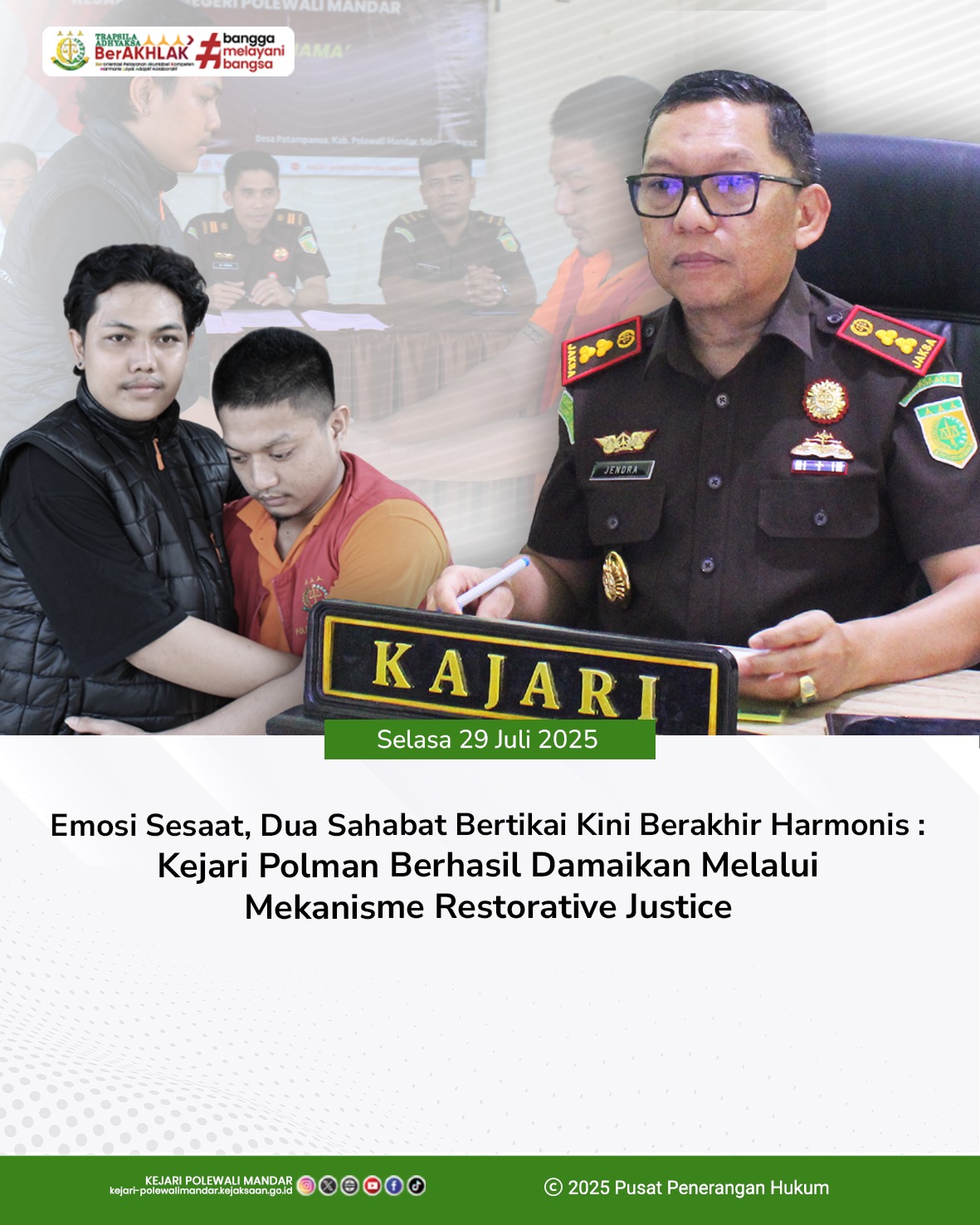 Jaksa Agung melalui Jaksa Agung Muda Tindak Pidana Umum (JAM Pidum) Prof. Dr. Asep Nana Mulyana, SH., M.Hum., mengapresiasi upaya perdamaian yang diupayakan jaksa fasilitator terhadap korban dan pelaku sekaligus menyetujui agar penyelesaian perkara tersebut dilakukan berdasarkan keadilan restoratif tanpa dilanjutkan ke tahap penuntutan (pemeriksaan di persidangan).