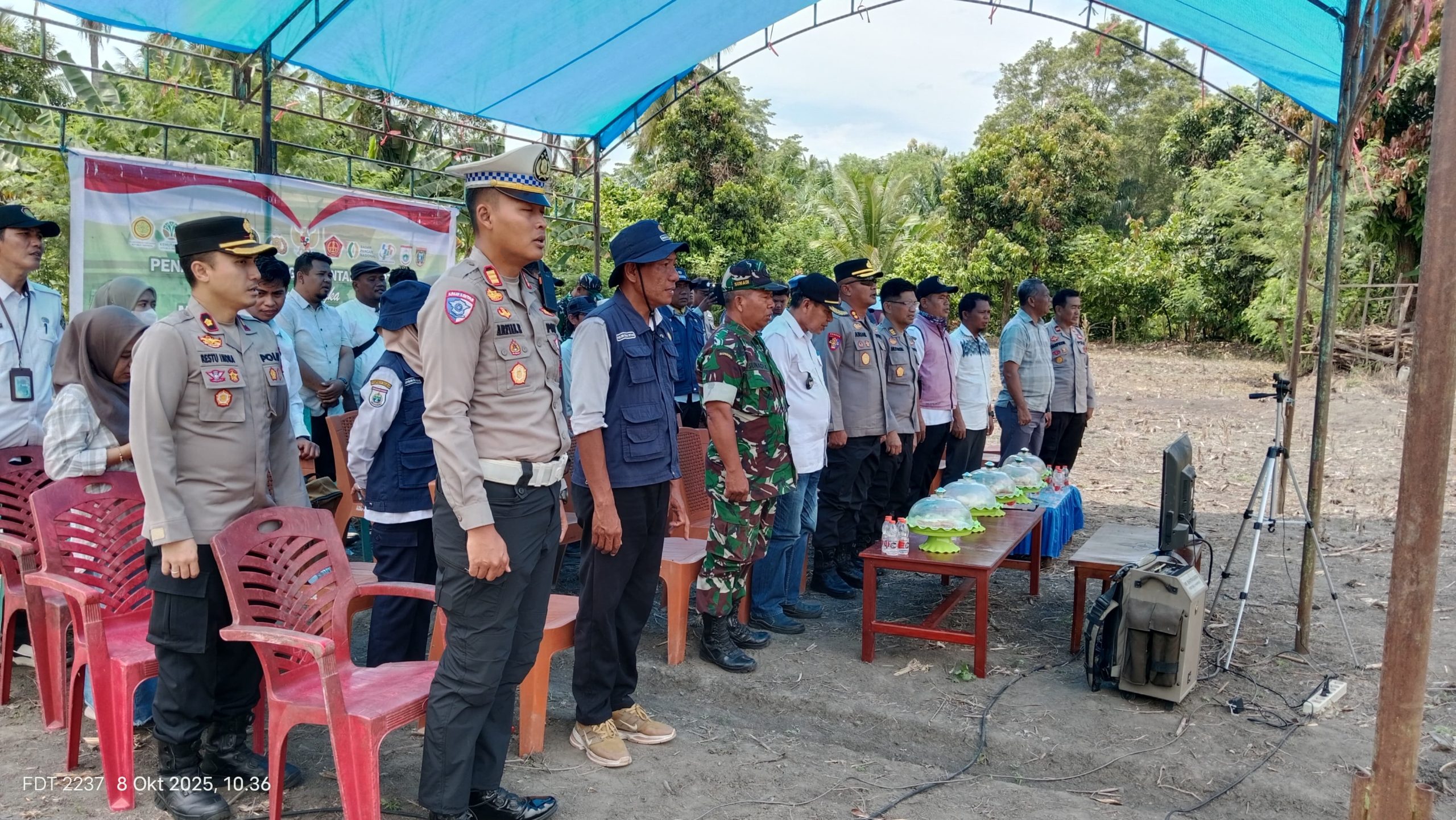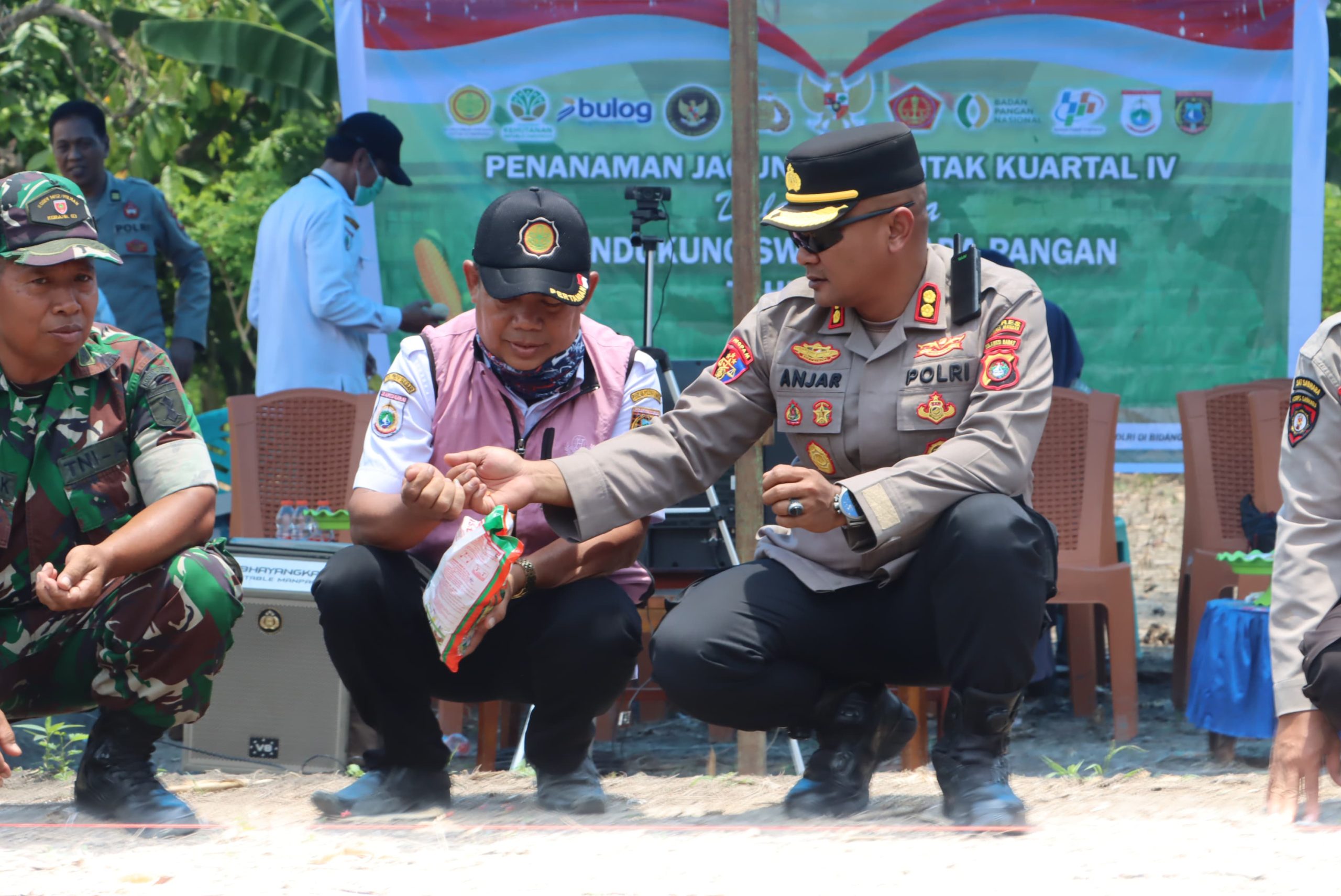Usai mengikuti rangkaian kegiatan virtual, Kapolres Polman Akbp Anjar Purwoko bersama Forkopimca Campalagian secara simbolis melaksanakan penanaman bibit jagung di lahan milik Ahmad alias Bapak Wahyu, seluas 75 are, yang berlokasi di Dusun Gattungan, Desa Gattungan.