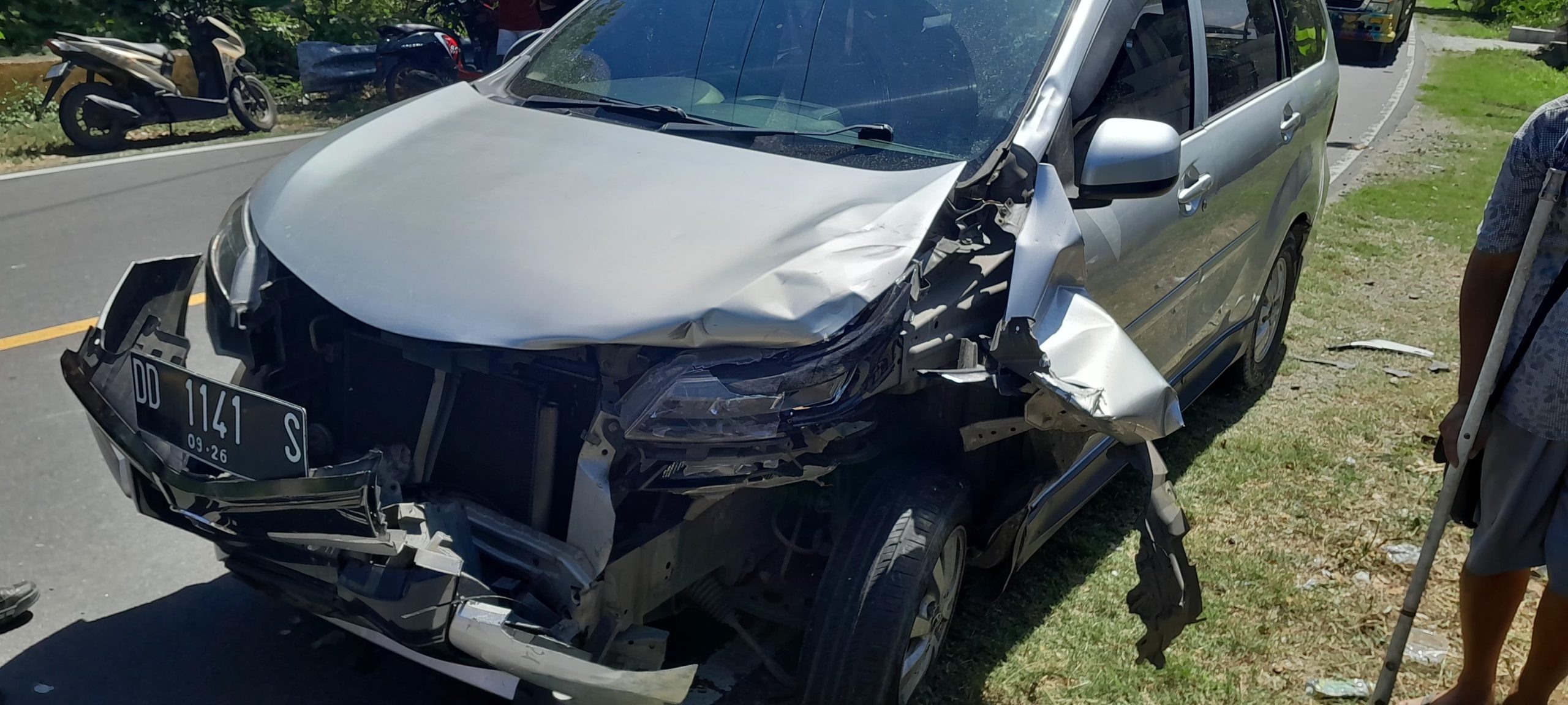 Di saat bersamaan, motor yang dikendarai Muh. Fajar datang dari arah berlawanan. Diduga pengendara motor hilang kendali hingga masuk ke jalur mobil, sehingga benturan tidak dapat dihindari.