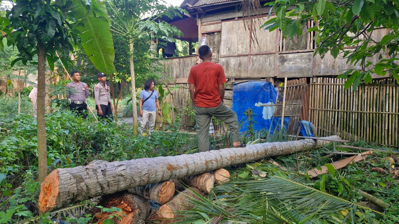 POLMAN, SULBARTODAY — Personel Polsek Tinambung mendatangi Tempat Kejadian Perkara (TKP) pohon kelapa tumbang yang menimpa rumah warga di Desa Sepabatu, Kecamatan Tinambung, Kabupaten Polewali Mandar, Jumat (19/12/2025) sore.